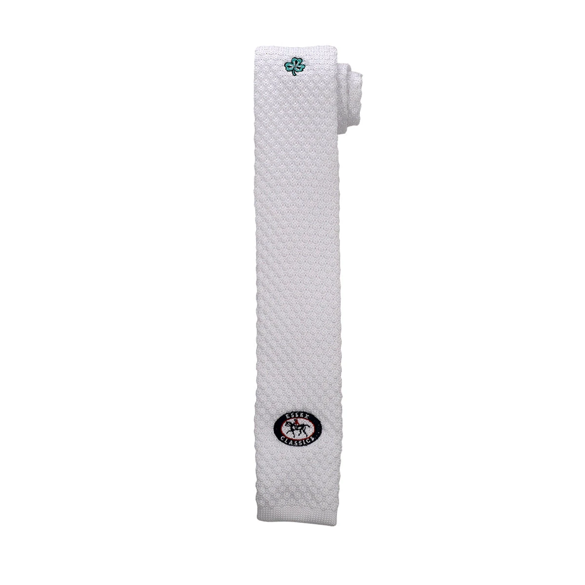 Handsome white polyester knit necktie with Essex logo and the Babington clover.